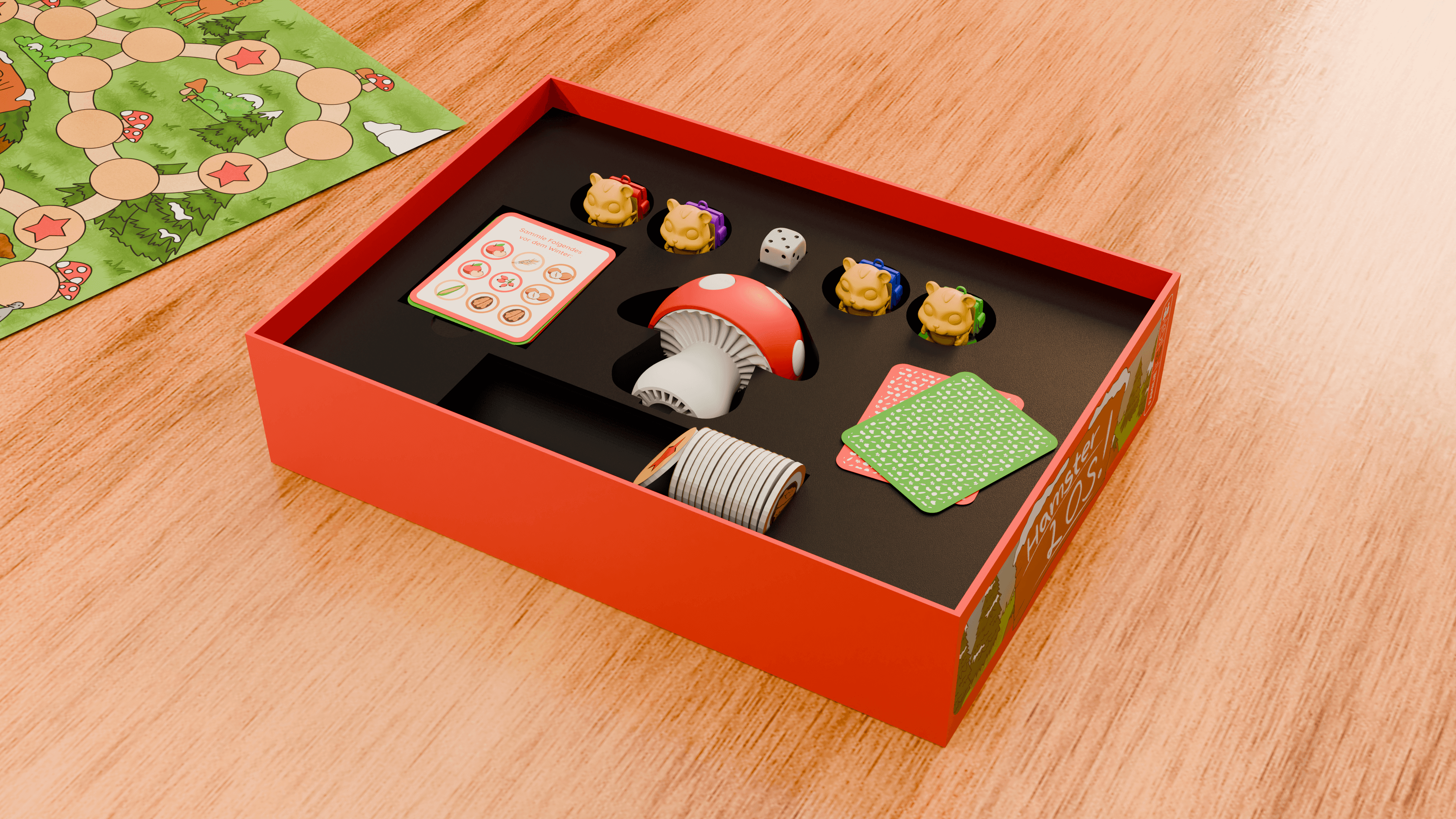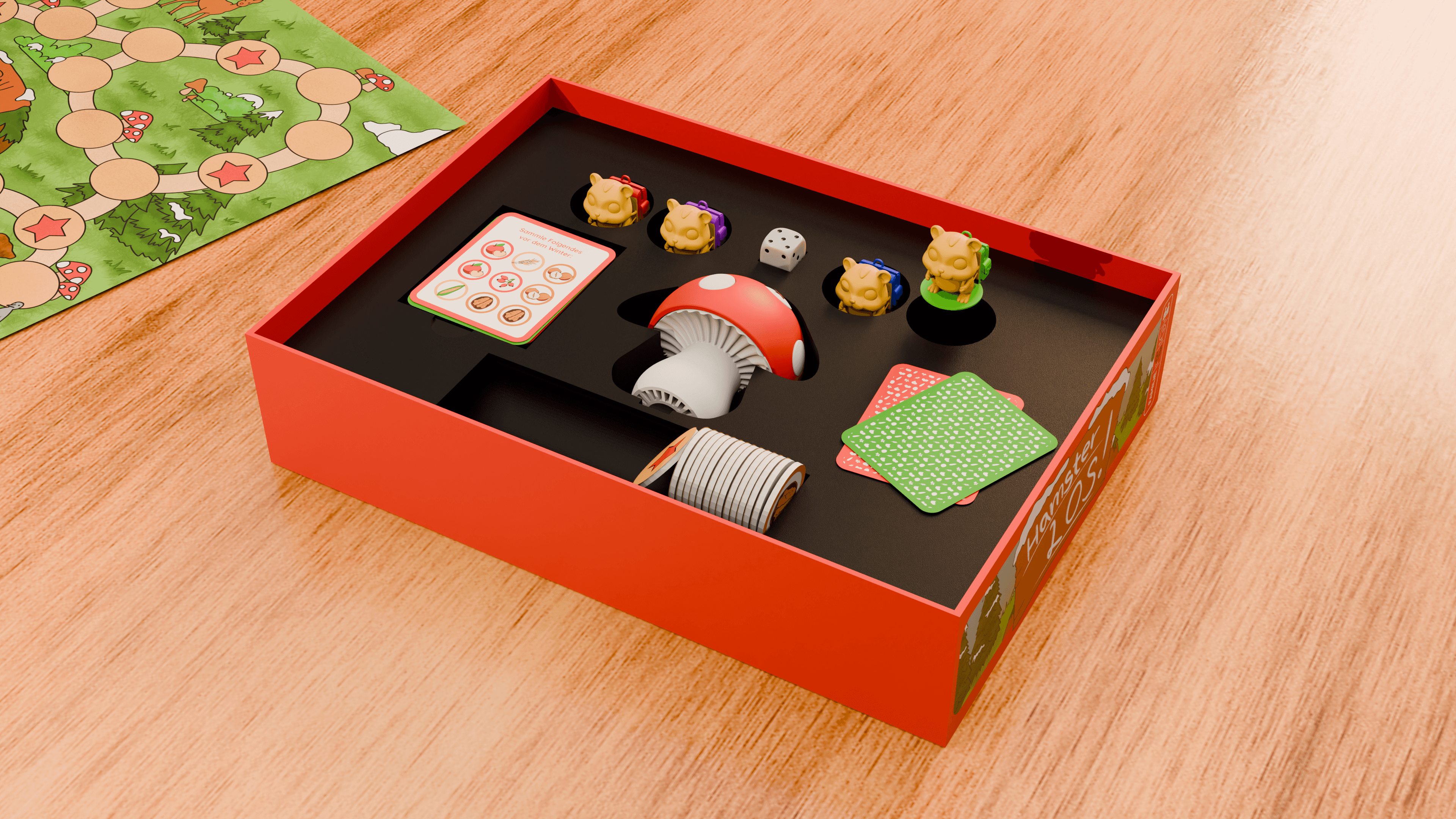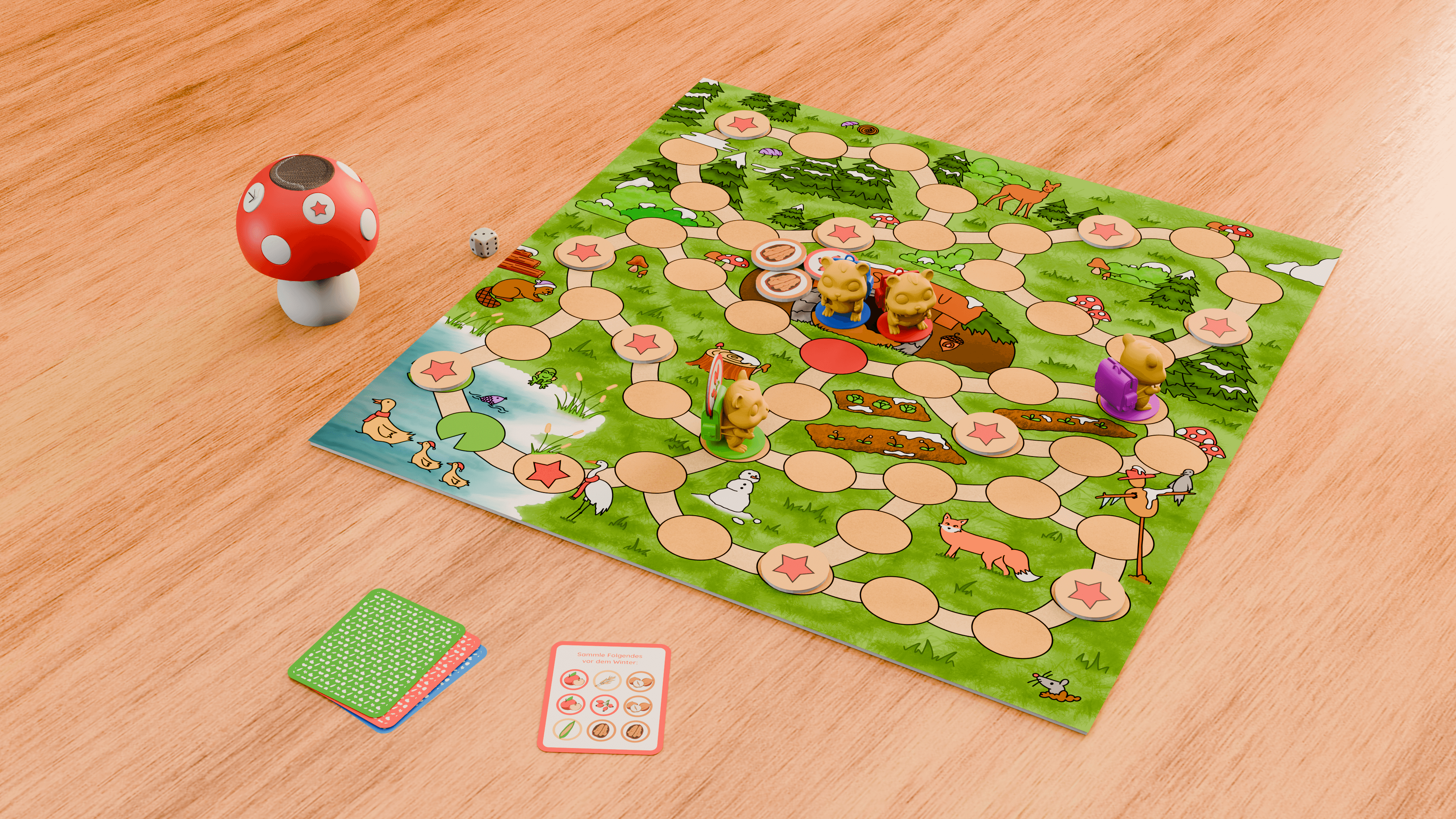 Mit Würfeln erkunden die Hamster den Wald, decken auf bestimmten Feldern Nahrungs-plättchen auf und transportieren sie im Rucksack zurück zum Bau. Jeder Hamster kann nur ein Plättchen tragen, doch die Hamster können die Plättchen untereinander weitergeben, sodass Wege optimiert und Zeit gespart werden kann.
