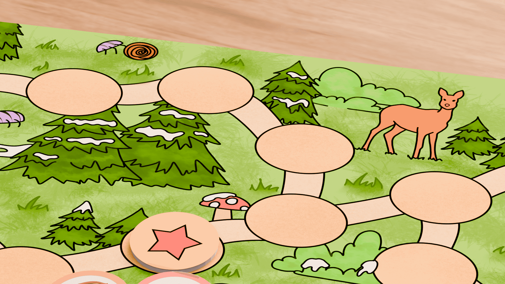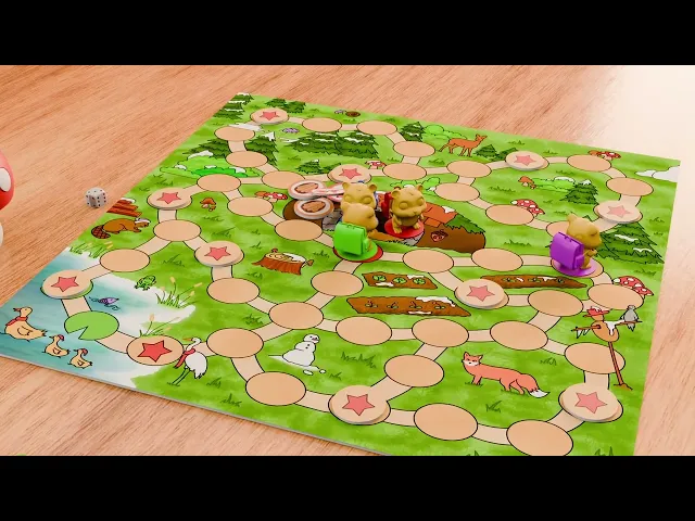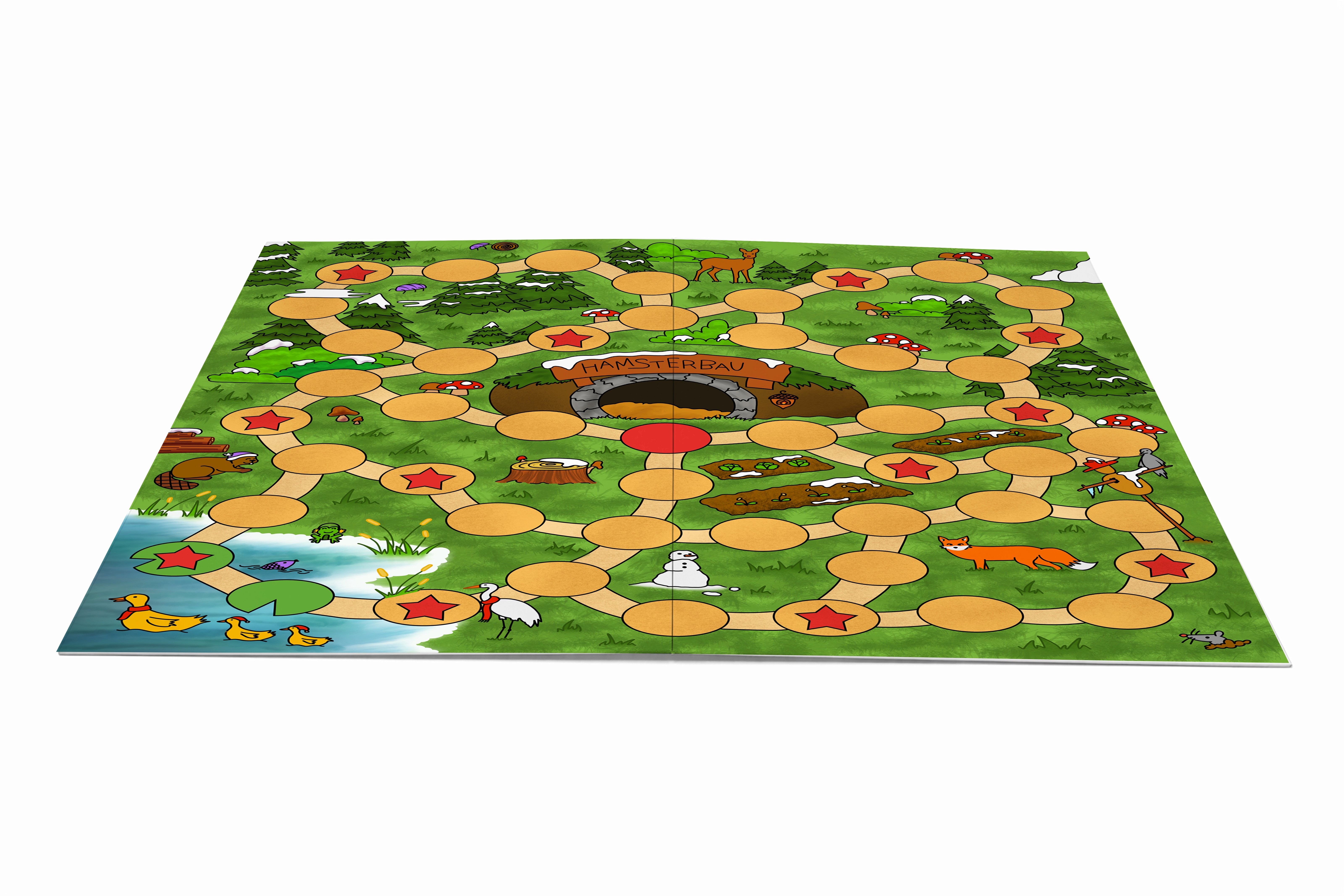 Es ist für Kinder gestaltet und arbeitet daher mit einfacheren Illustrationen, dicken Umrandungen und flächigen Farben. Der Untergrund und die Bäume sind zusätzlich schattiert und strukturiert um mehr Struktur sowie Detail ins Spielbrett zu bringen.