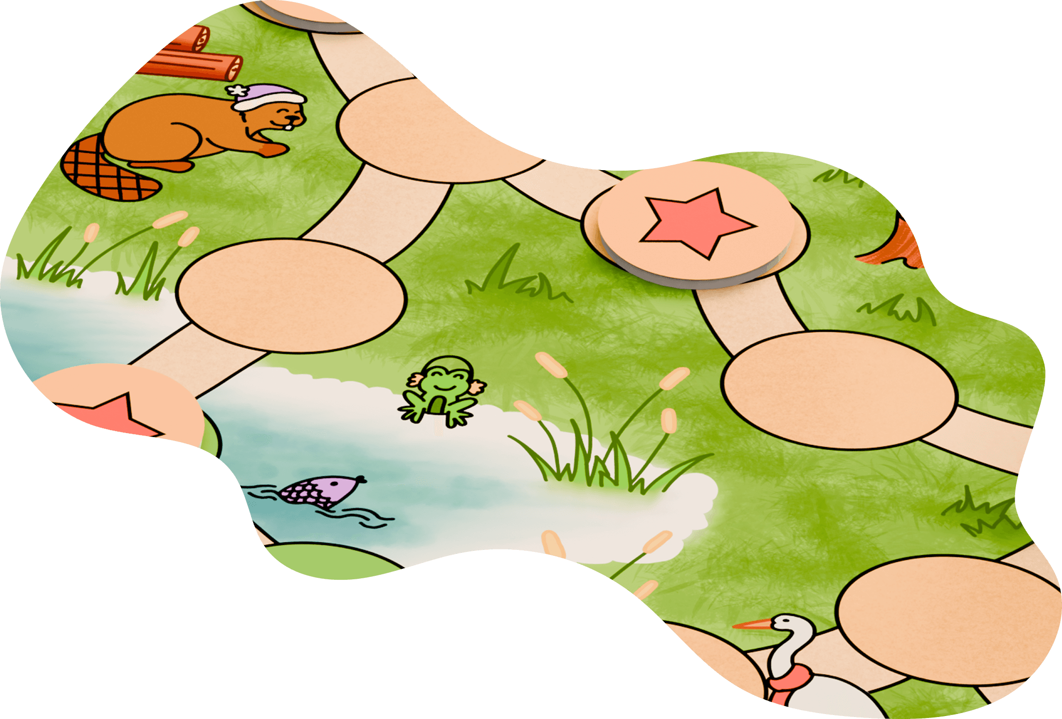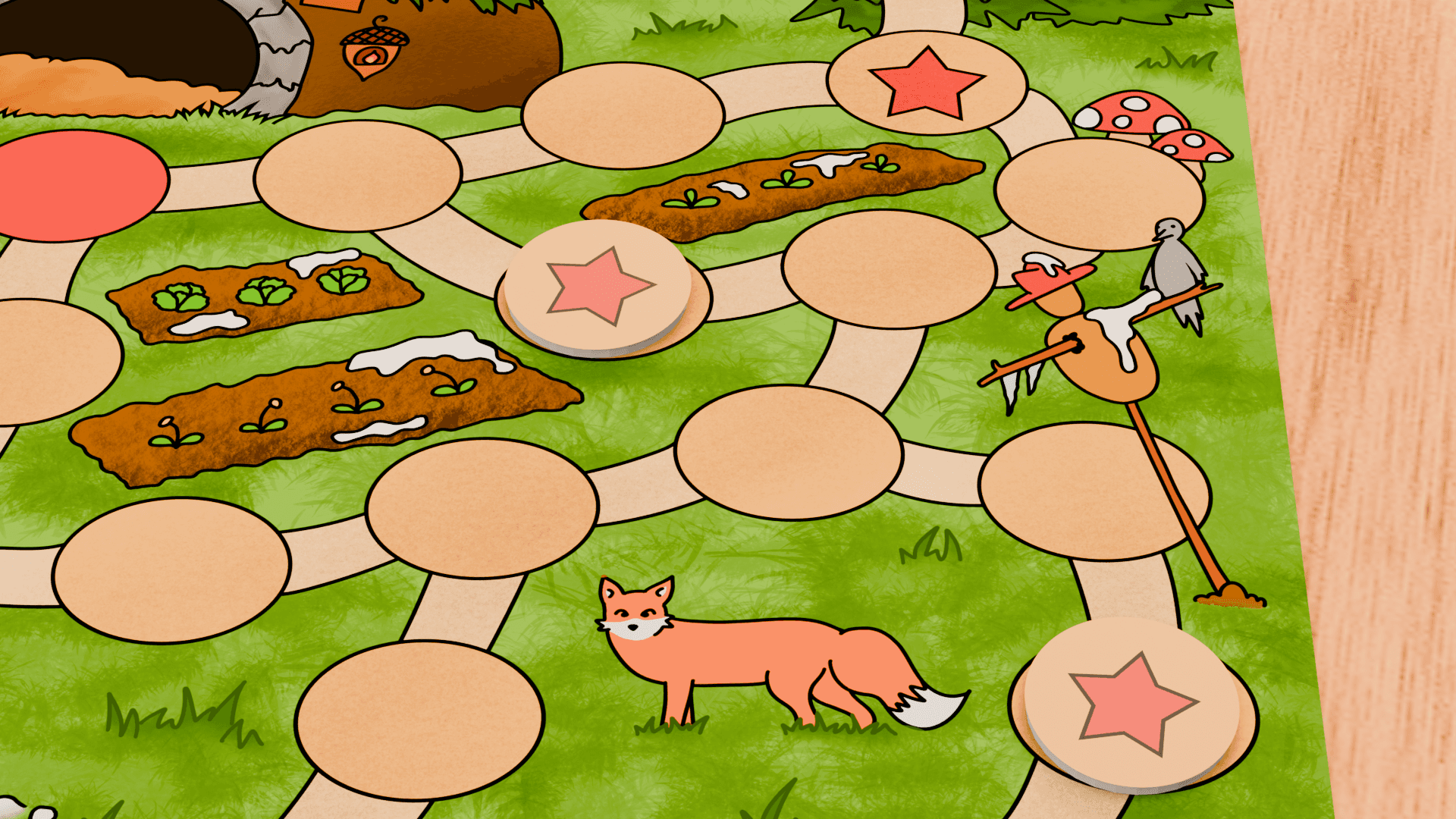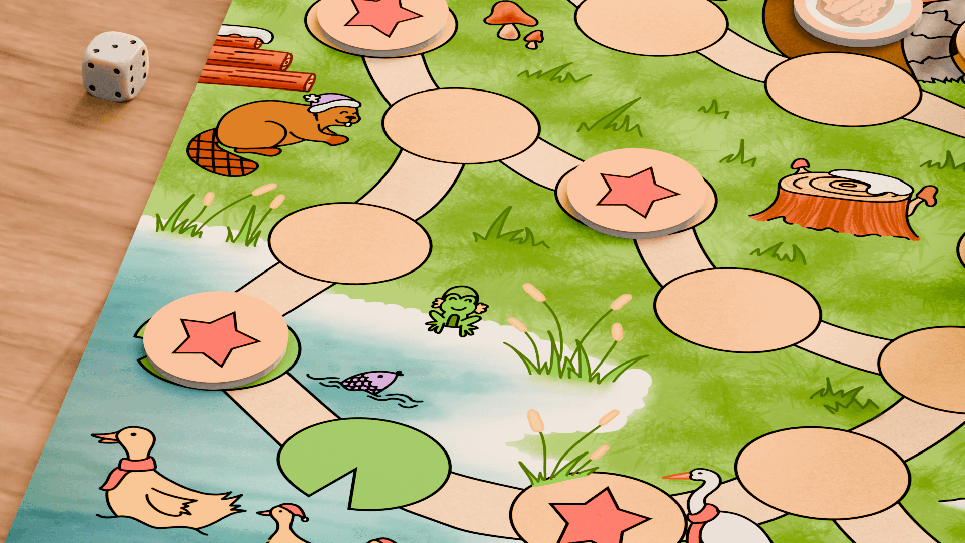 Es ist für Kinder gestaltet und arbeitet daher mit einfacheren Illustrationen, dicken Umrandungen und flächigen Farben. Der Untergrund und die Bäume sind zusätzlich schattiert und strukturiert um mehr Struktur sowie Detail ins Spielbrett zu bringen.