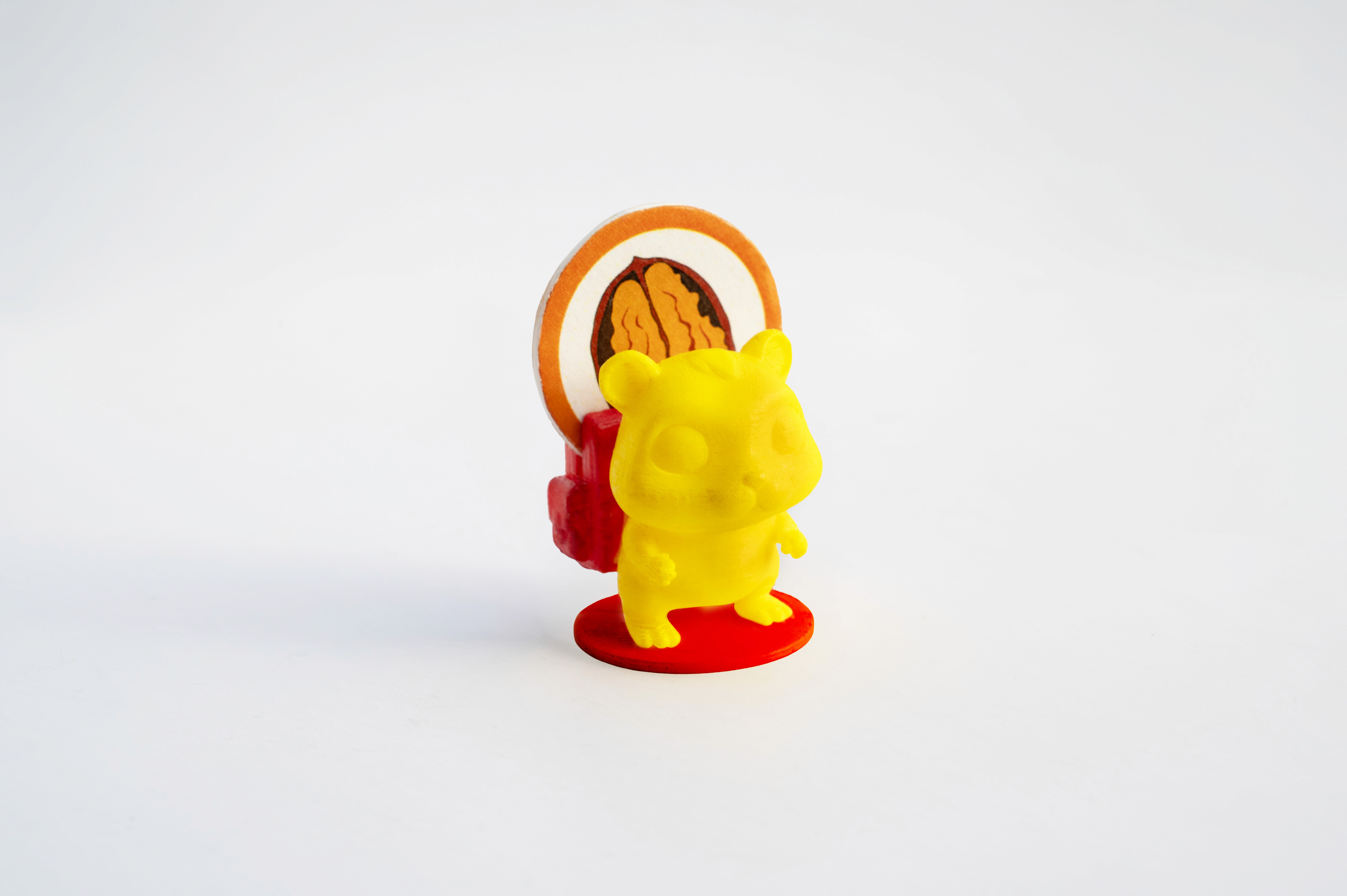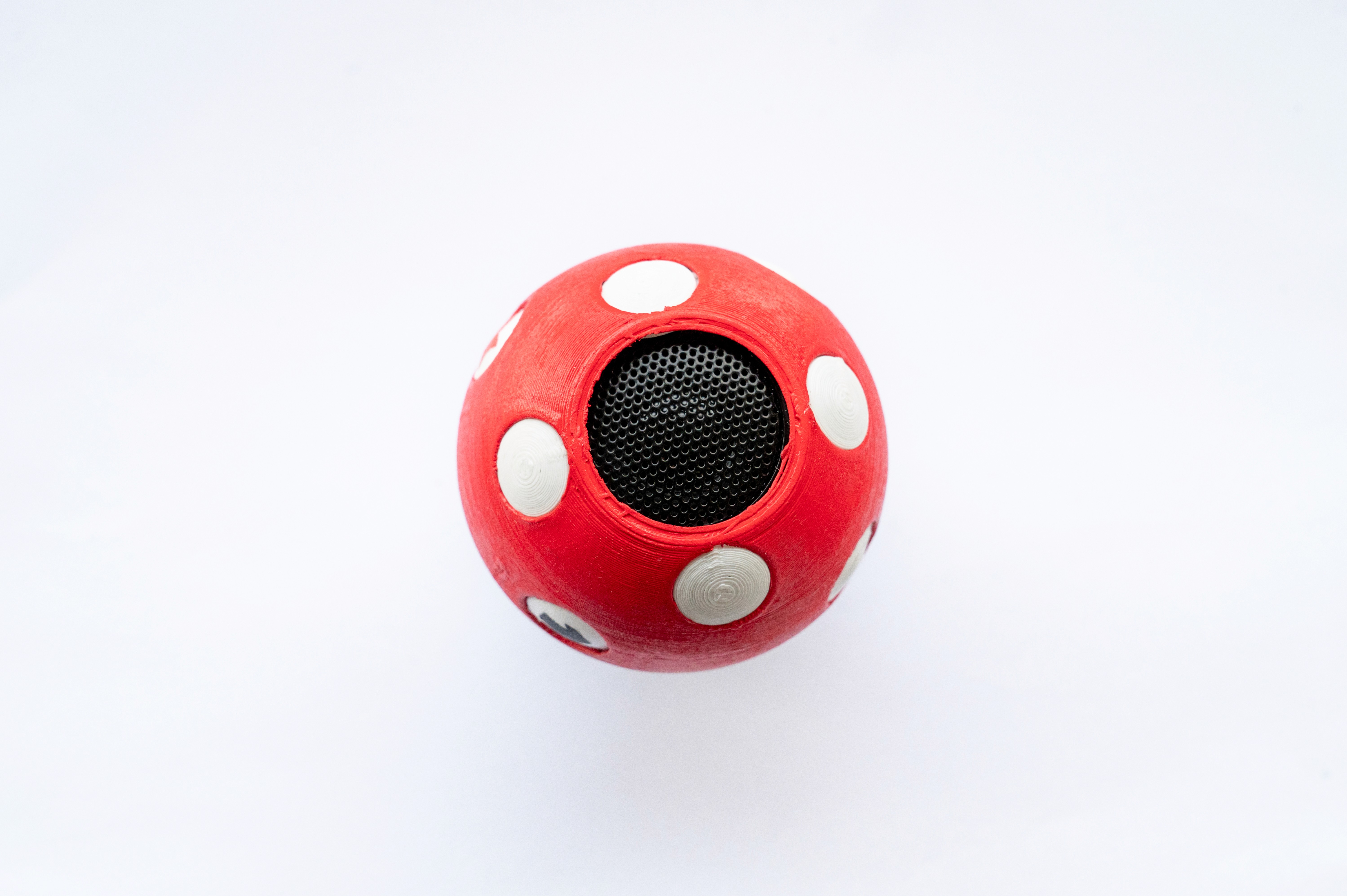 So entstanden auch der sprechende Pilz sowie die Nahrungsplättchen. Beim sprechenden Pilz wurde zusätzlich ein Lautsprecher inklusive Technik integriert. Durch den hohl gestalteten Deckel findet die Technik dort einen Platz. Zwei der weißen Punkte dienen als Bedienelemente zur Steuerung des Pilzes.